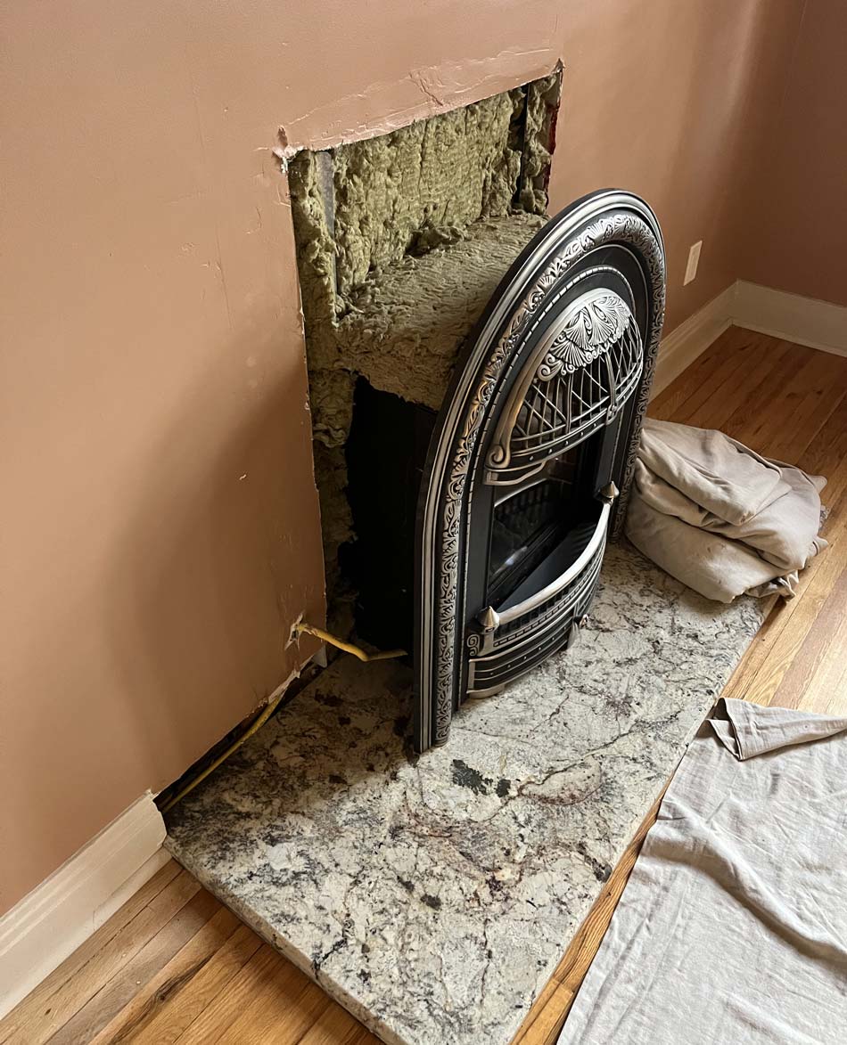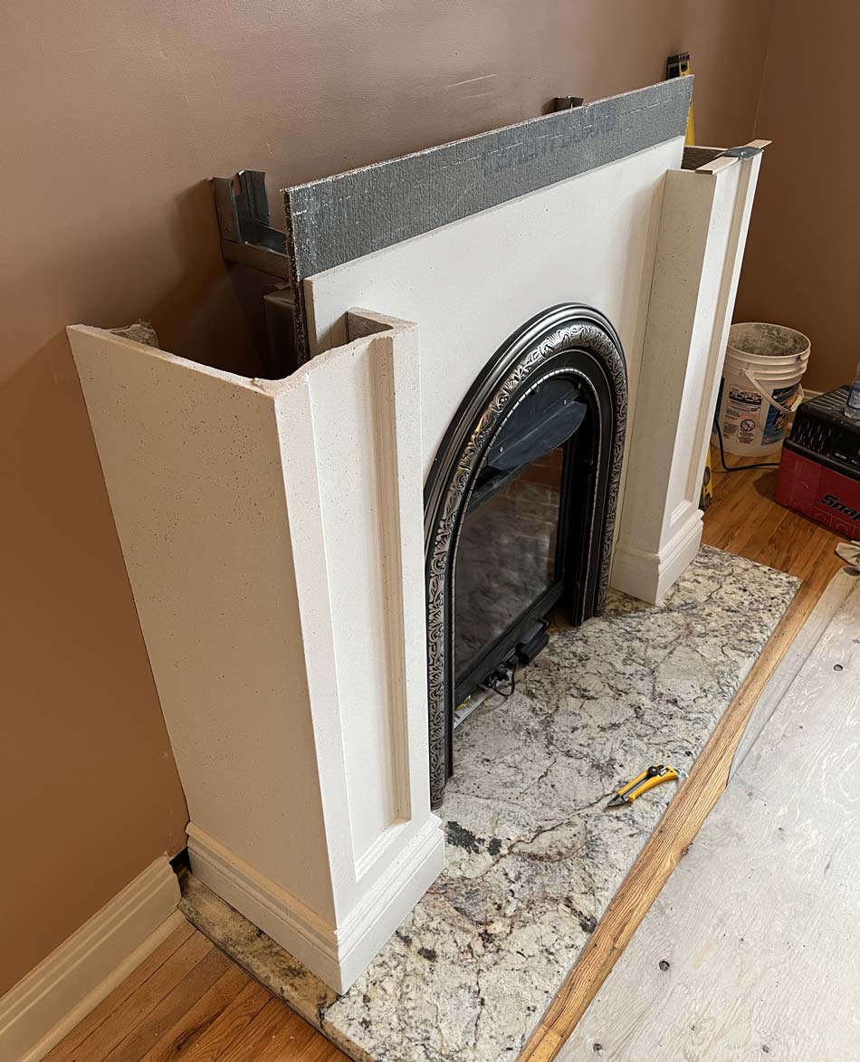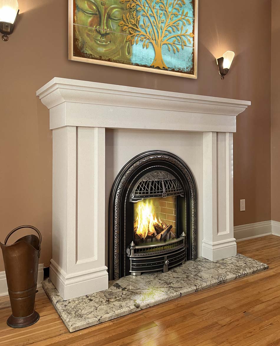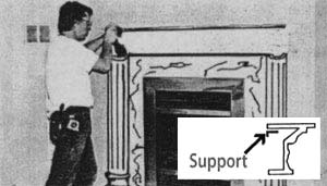 • Un foyer qui chauffe tend à prendre de l'expansion. Il est obligatoire de laisser un espace de 1/8 de pouce entre le manteau et le foyer. S'il y a un contour de marbre, de céramique ou autre matériau non affecté par l'expansion du foyer, le manteau peut alors être appuyé directement dessus le matériau.